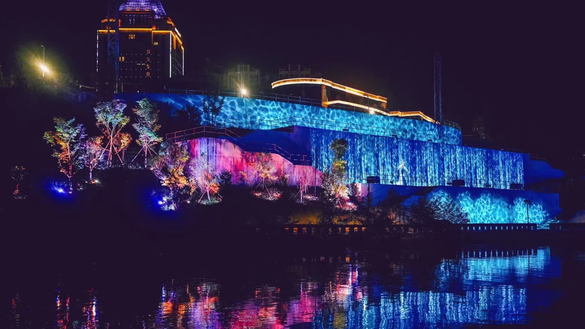 夜幕时分,华灯初上,在优美动听的音乐中,游客们纷纷登上乌篷船,迈入一场沉浸式的时空穿越旅途,依次体验“恩阳船说”的八大篇章。当人们欣赏过精心编设的演出,仍沉浸在两宋归一、龙凤合璧的家国情怀中时,河畔平台的巨幅投影不其然地悄悄淌入了视界。只见河堤上光影在流水的环抱下,恩阳故事在特制影片中展开,氛围竟比幽深的河水本身更显清冽。轻纱曼舞,水光潋滟,与近旁被点亮的炫彩花木相映成趣,引发游人阵阵赞叹。